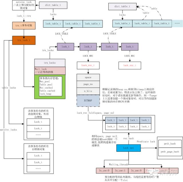 InnoDB 所有的事务锁对象都是挂在全局对象lock_sys上,同时每个事务对象上也维持了其拥有的事务锁,每个表对象(dict_table_t)上维持了构建在其上的表级锁对象。